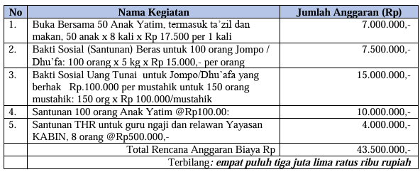 (5) Santunan Tunjangan Hari Raya (THR) guru ngaji dan relawan Yayasan KABIN. Sasaran: sebanyak 8 orang guru ngaji dan relawan Yayasan KABIN dengan besaran Rp.500.000 per orang. Namun demikian, kami tidak membatasi hanya kepada lima kegiatan tersebut du atas. Apabila ada usulan dari para donator kami siap melaksanakannya sepanjang usulan tersebut terkait dengan ibadah sosial atau amal bakti kepada sesama di bulan Ramadhan.