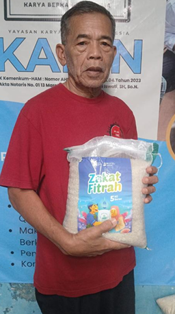 (2) Bakti sosial (santunan) jompo/dhuafa, berupa pemberian beras 5 kg / mustahik. Sasaran: Jompo dan dhu’afa penduduk RW. 03 dan 04 Kelurahan Sukapura Kiaracondong serta orang tua anak asuh Yayasan KABIN sebanyak 100 orang.