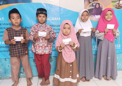 (4) Santunan anak yatim/dhu’afa Rp.100.000 per anak/per dhu’afa. Sasaran anak yatim asuhan Yayasan KABIN dan anak yatim/duafa di RW. 03 dan 04 Kelurahan Sukapura Kiaracondong, sebanyak 100 anak yatim.
