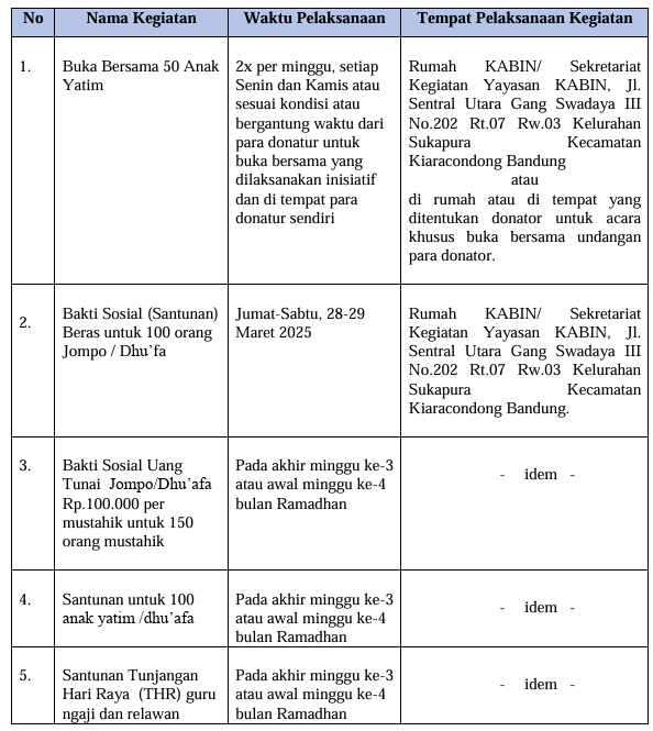 (1) Buka bersama anak yatim. Sasaran: minimal sebanyak 8x (2x per minggu) yang diselenggarakan di Rumah KABIN, atau lebih jika ada tawaran dari donatur, kapan saja waktunya selama bulan Ramadhan 2025; untuk masing-masing sebanyak 50 orang yatim.